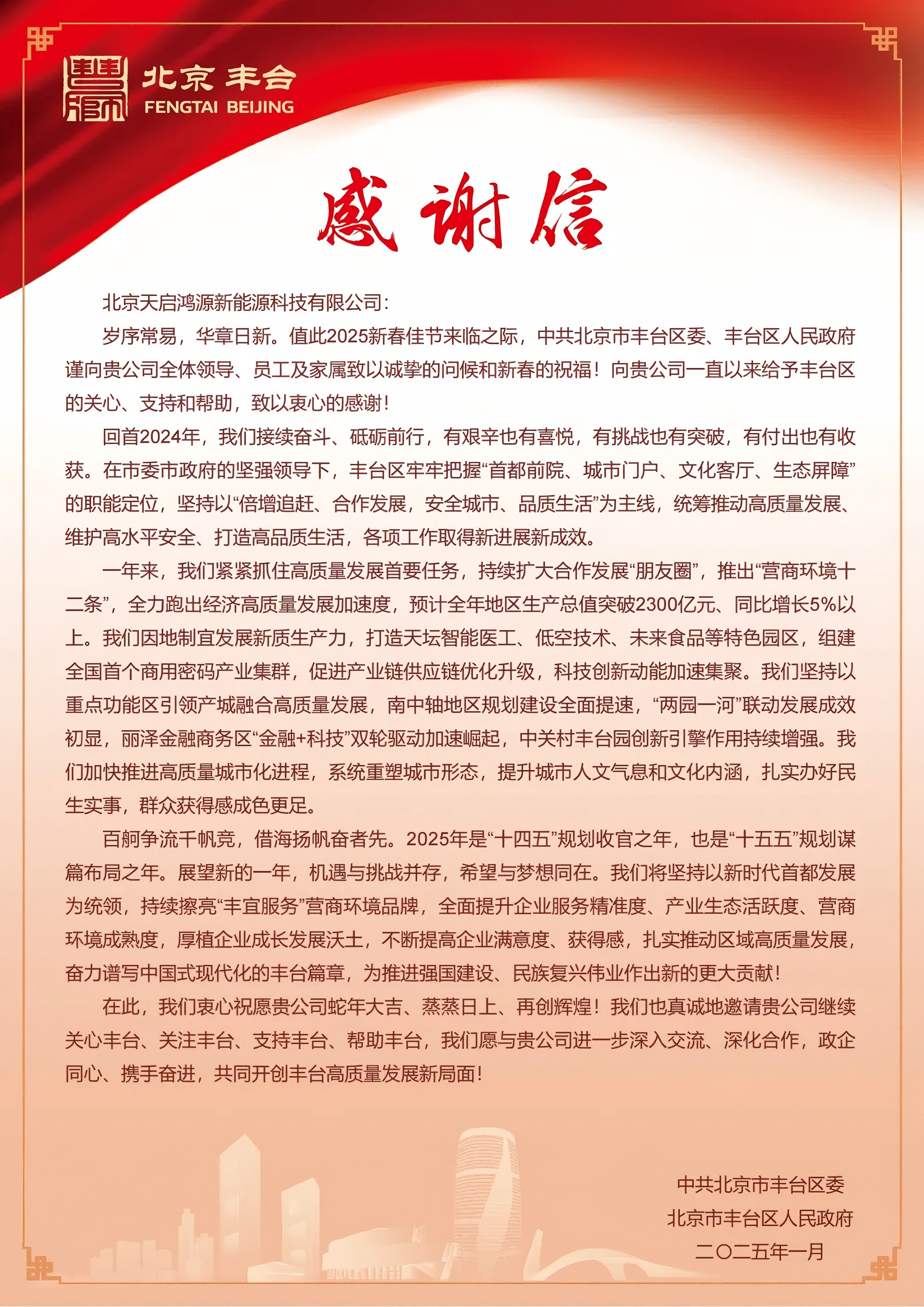 As the Lunar Year of the Snake approaches, we received a special gift—a letter of appreciation from the Fengtai District Party Committee and Government to Beijing Tianqi Hongyuan, acknowledging our strong support for Fengtai's technology service industry. This recognition not only affirms our efforts over the past year but also reflects expectations for our future development.