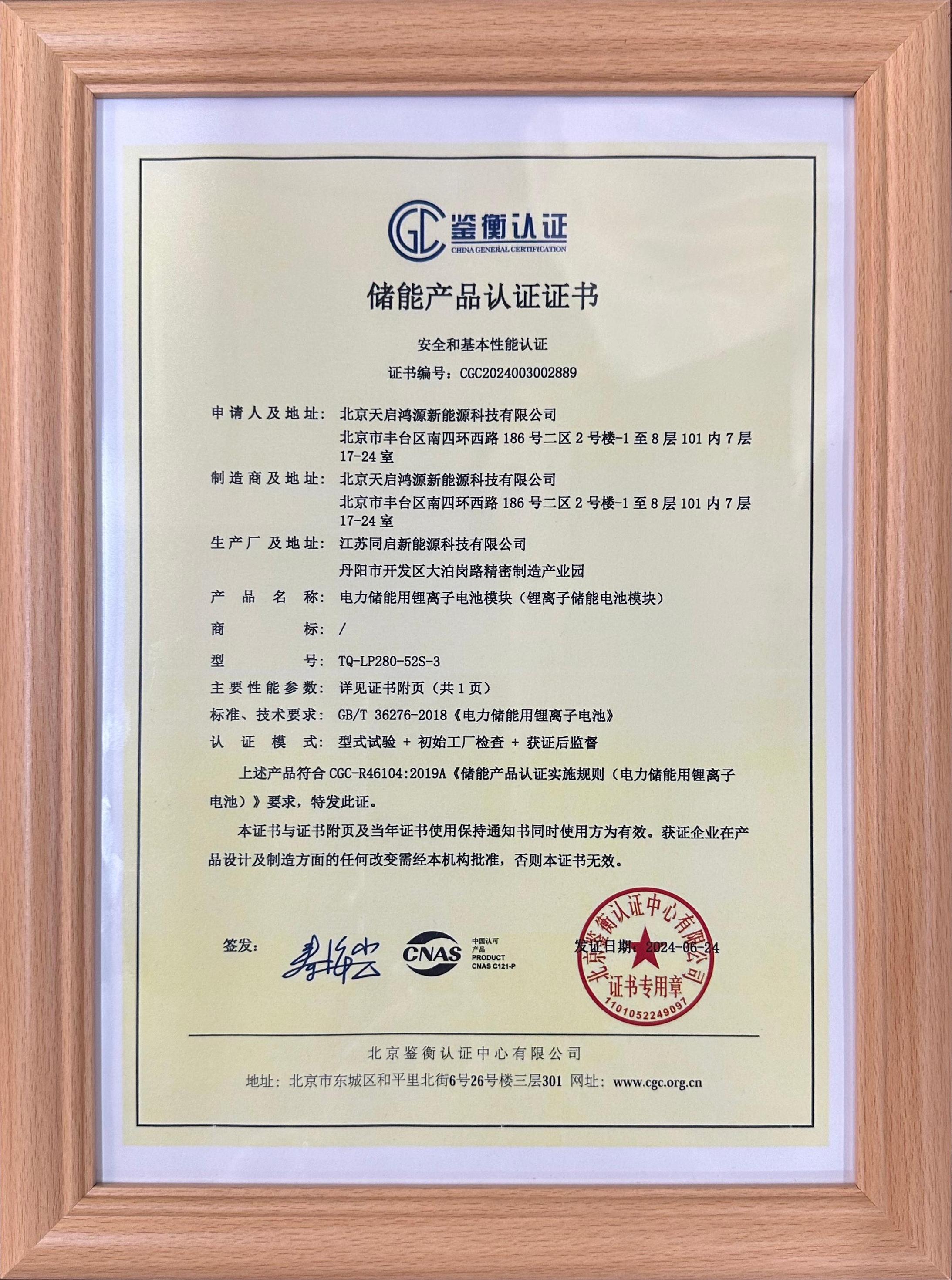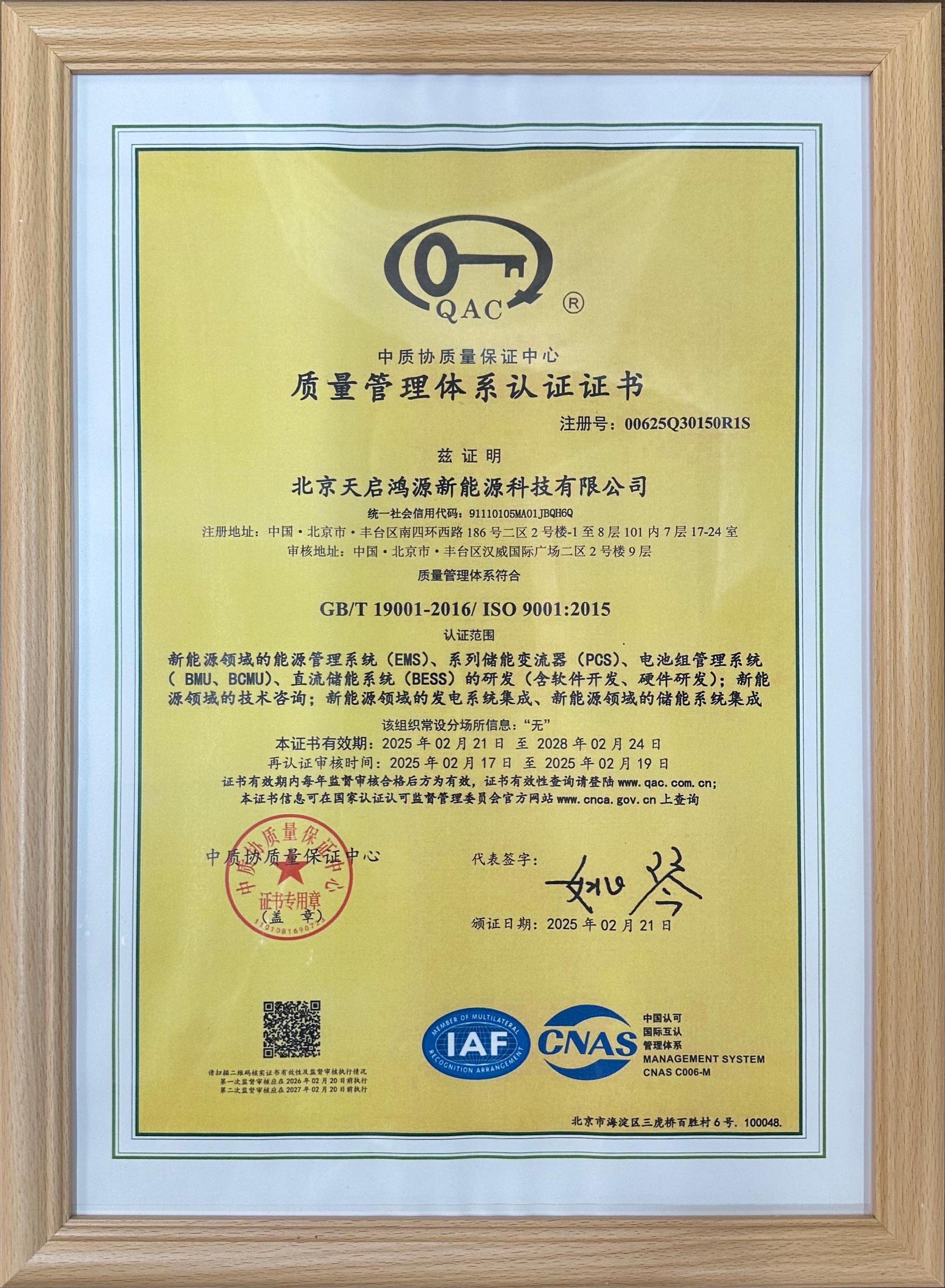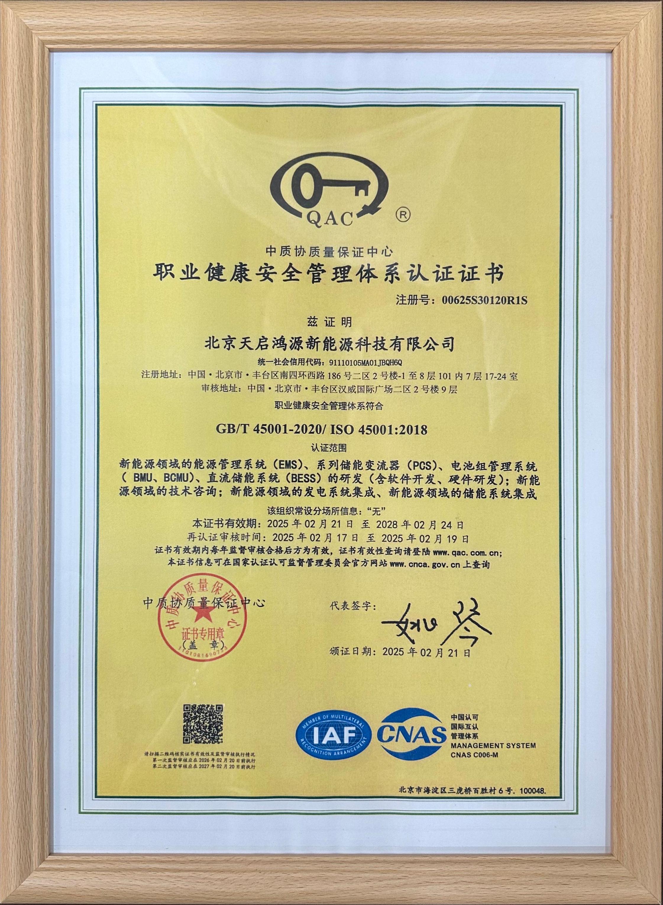 Beijing Tianqi Hongyuan New Energy Co., Ltd. was established in 2019. The company holds certifications as a High-Tech Enterprise and a Beijing “Specialized, Refined, Distinctive, and Innovative” SME. It has also obtained ISO certifications for quality, safety, environmental, and training management systems. Our energy storage products carry multiple certifications including TUV and Jianheng.